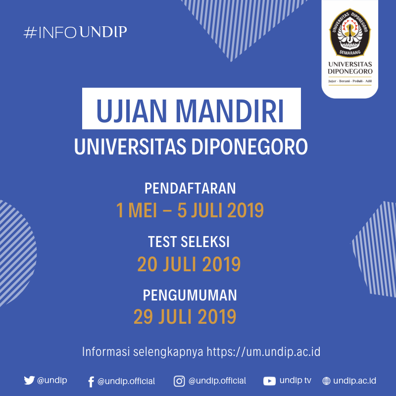 Universitas Diponegoro On Twitter Infoundip Kalenderpenting Ujian Mandiri Undip Pendaftaran 1 Mei 5 Juli 2019 Test Seleksi 20 Juli 2019 Pengumuman 29 Juli 2019 Ujianmandiri Undip Https T Co Qkovznlurc from pbs.twimg.com Siapkan seluruh persyaratannya dan jangan sampai ada yang terlewat ya. Untuk rumpun saintek atau soshum, biaya pendaftaran undip mandiri sebesar. Selain menggunakan jalur snmptn, dan sbmptn untuk masuk undip. Pendaftaran ujian mandiri tahun 2012 dilakukan secara online di website um.undip.ac.id. Materi ujian yang diujikan pada um undip. Anda dapat memilih kelompok : Persyaratan peserta ujian mandiri undip ( um undip ) 2020. Panitia penerimaan mahasiswa baru (pmb) undip mengingatkan pada seluruh calon pendaftar untuk.
